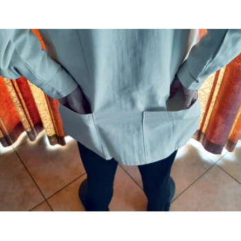 Avec fermeture éclaire prstique à l'avant, velcro pour bien fermer autour du cou. Le velcro du cou peut être "croché" en position ouverte très facilement. Possède 2 petites poches pour les crayons sur la manche et 2 grandes poches à l'arrière pour éviter quelles ne se remplissent de copeaux. Les manches se ferment au poignes avec du velcro.